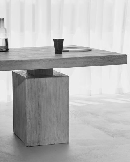 Reclaimed Oak in its most expressive form, textured, tonal, and full of character, paired with upholstered dining in softened palettes. The result is a considered interplay of material and form.