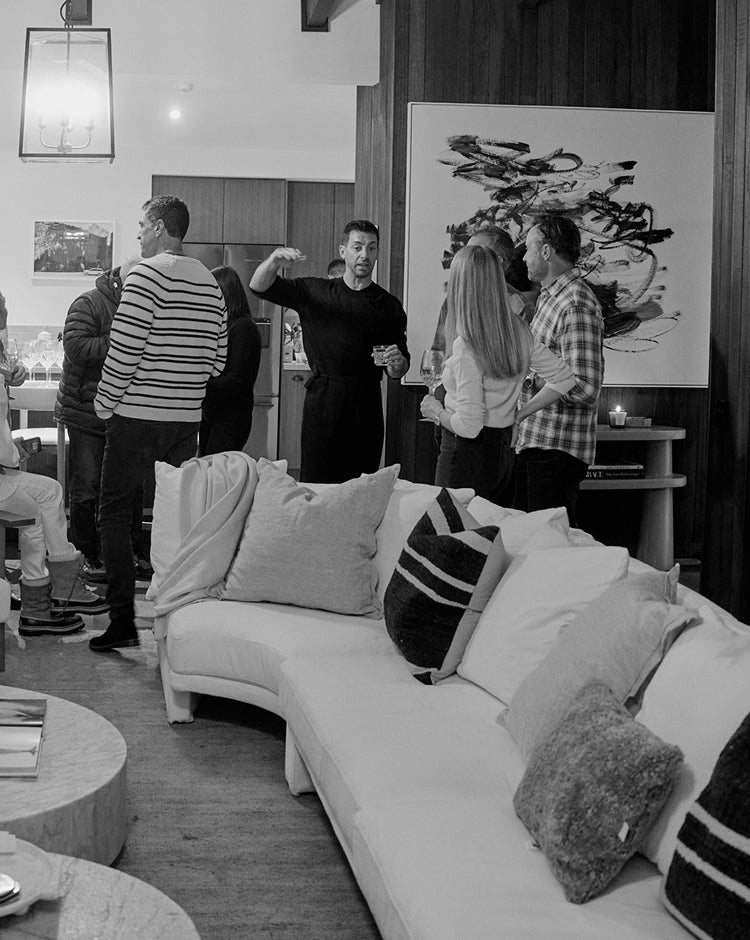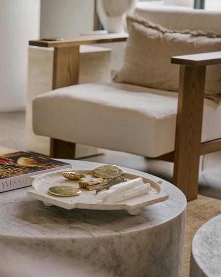 Inspired by 1970s lounges and alpine hideaways, Nivara’s low-slung silhouette and enveloping forms invited guests to unwind. Anchored by White Carrara Marble Monument Coffee Tables and accented with the Arabescato Marble Arii Side Table, the setting created a sanctuary of warmth and relaxation.